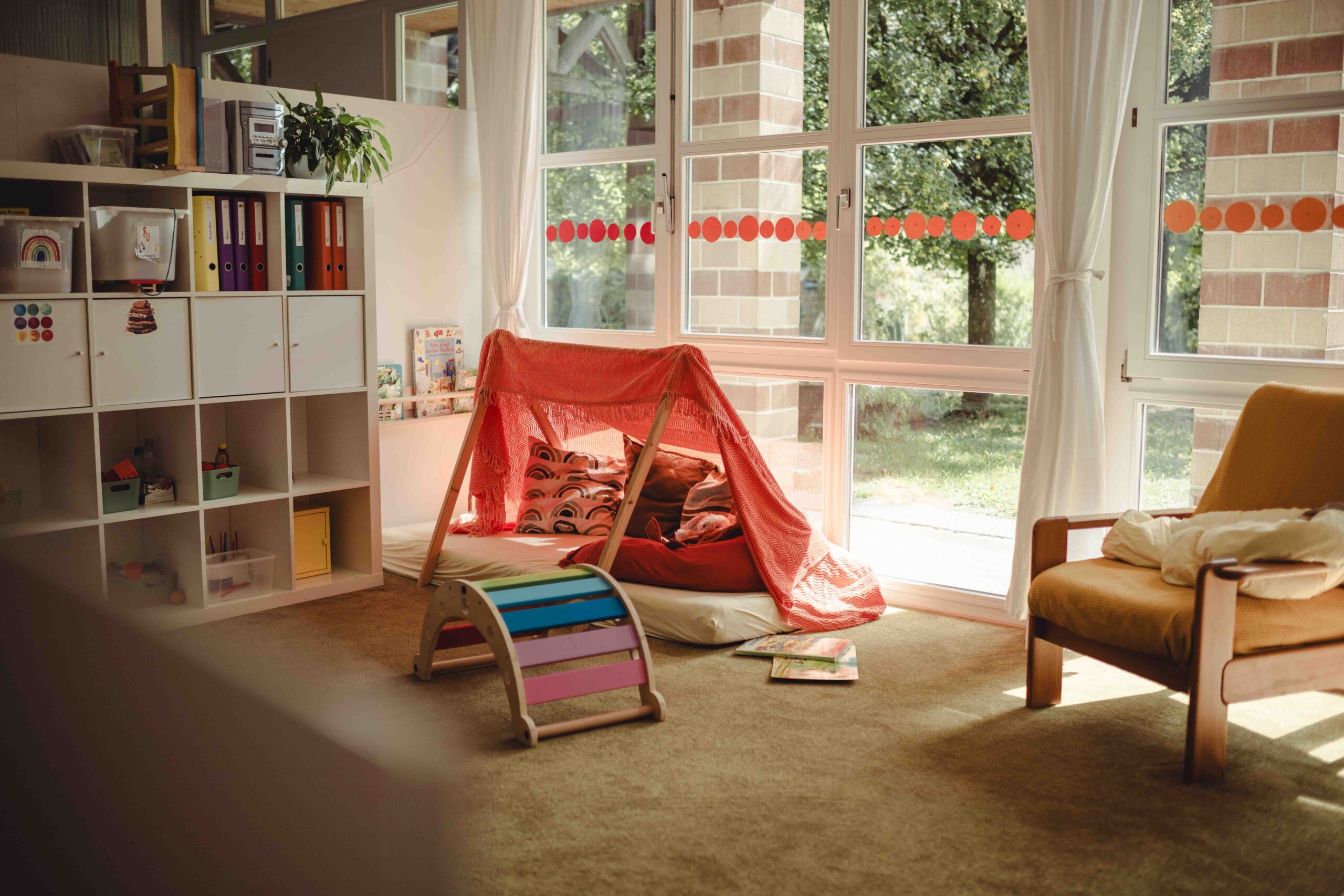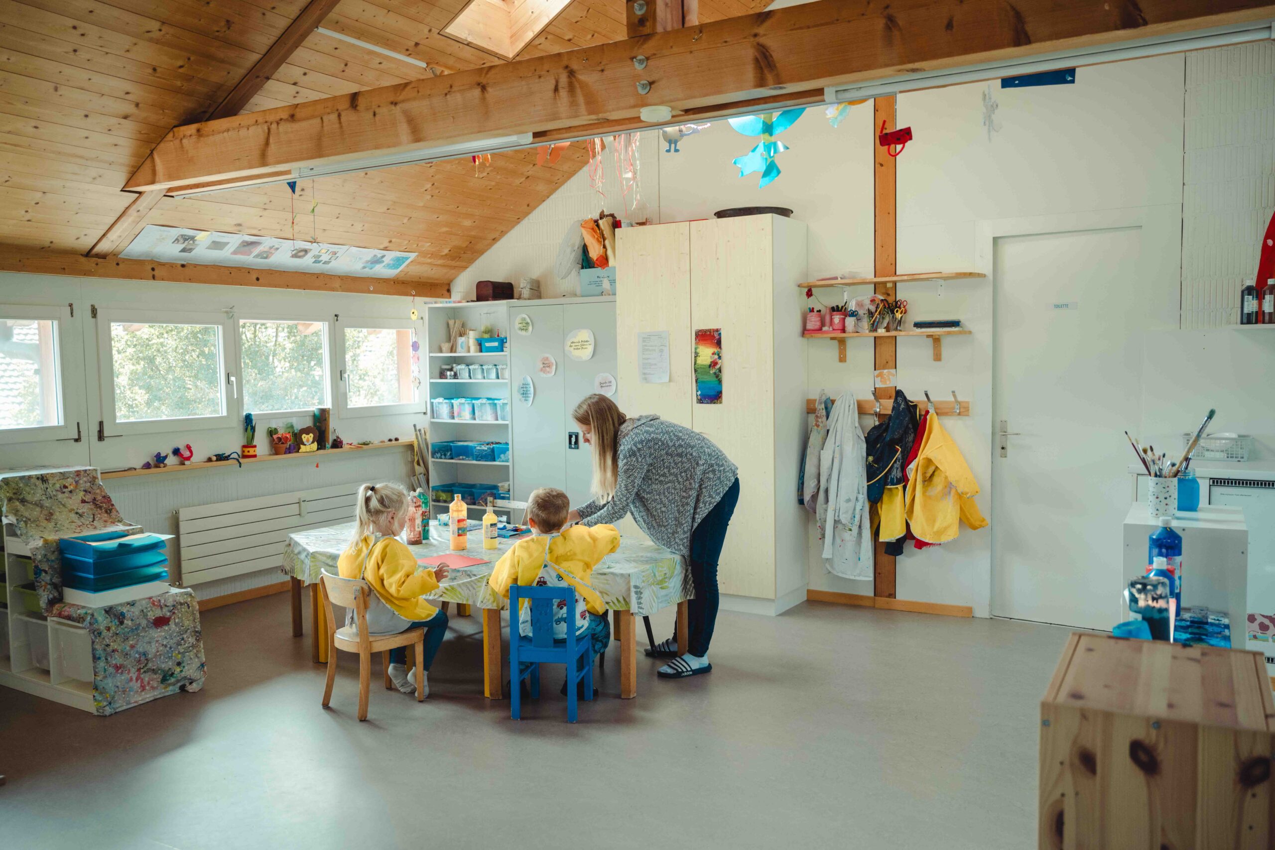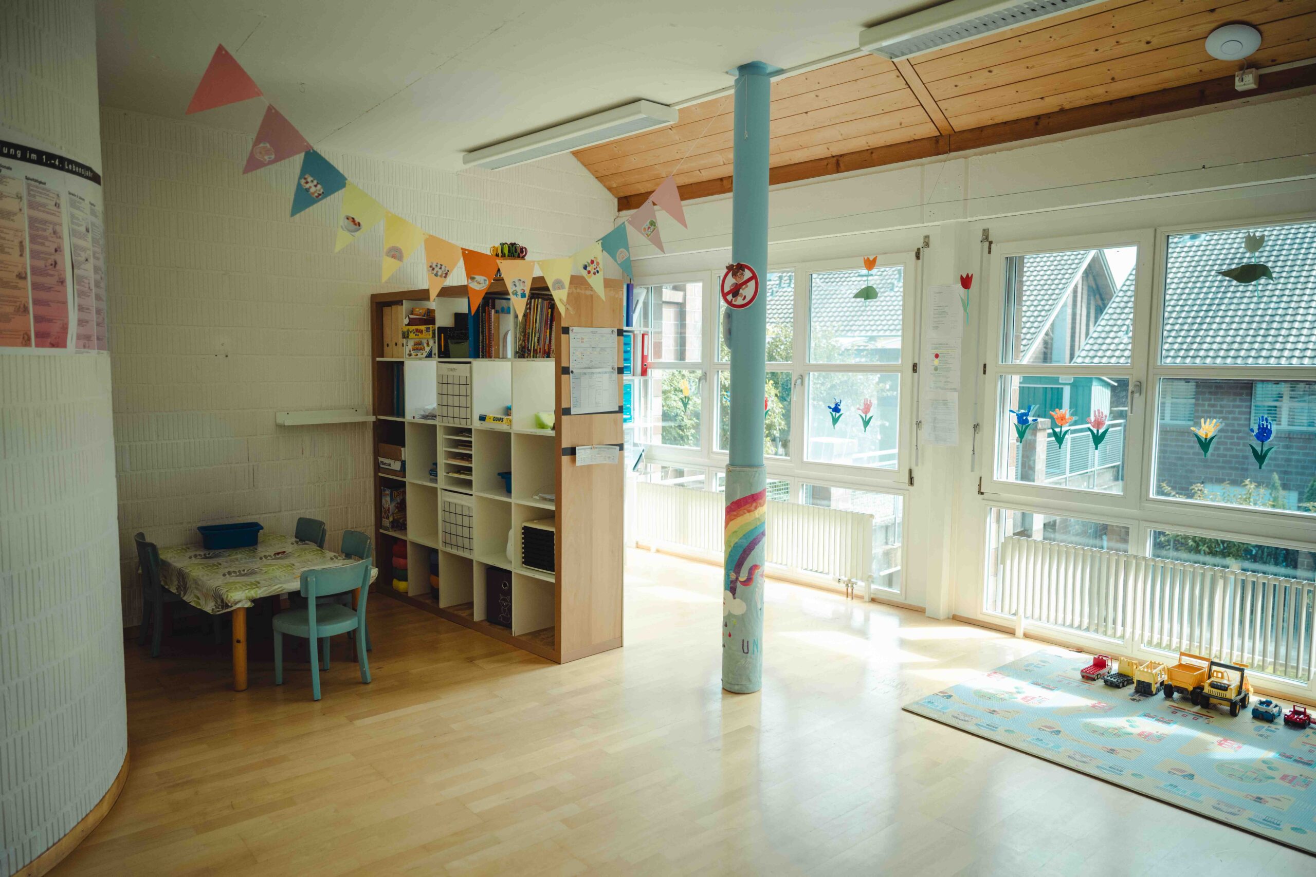 Unsere Kita bietet grosszügige, helle Räumlichkeiten, die Kindern viel Platz zum Spielen, Lernen und Wohlfühlen geben. In liebevoll gestalteten Themenräumen fördern wir die Kreativität und Neugier der Kinder: Ob beim Basteln, Malen oder Werken mit Holz – hier finden kleine Entdeckerinnen und Entdecker den idealen Raum, um sich kreativ auszuleben. Eine gemütliche Sensorik-Ecke lädt dazu ein, die Welt mit allen Sinnen zu erforschen.
